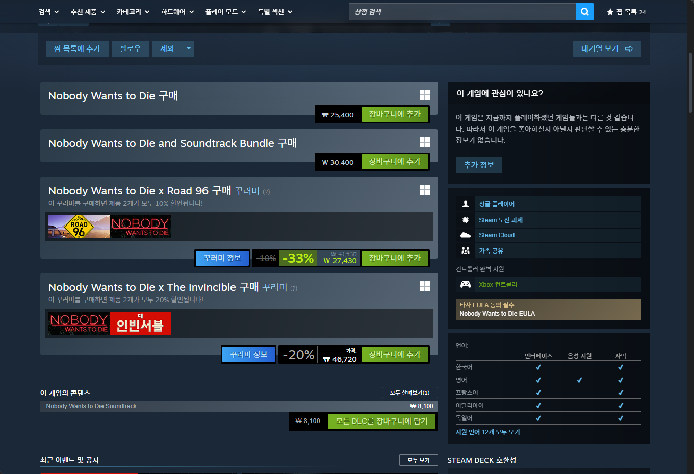- "Nobody Wants to Die (노바디 원츠 투 다이)" 게임 보유 확인