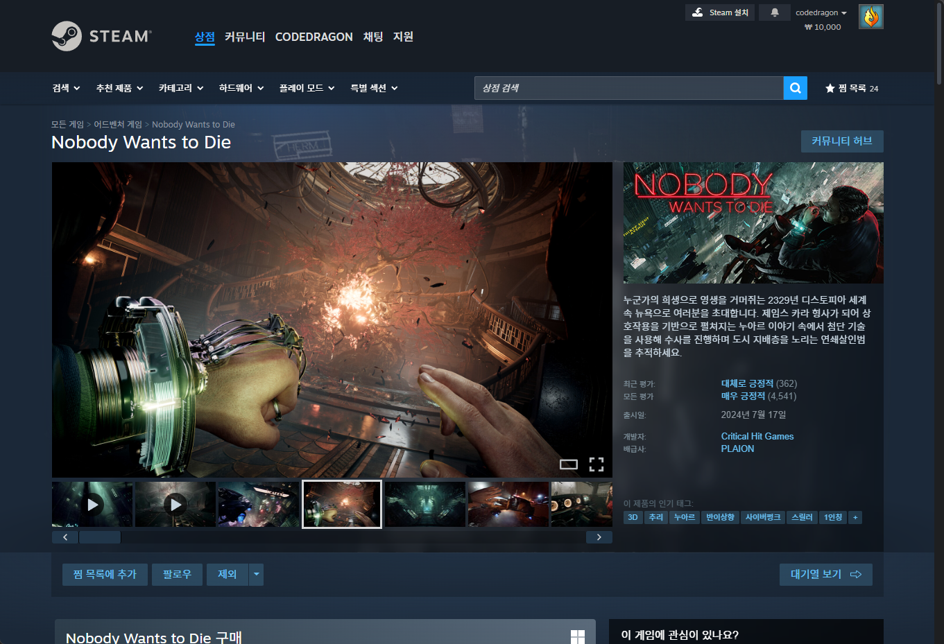 "Nobody Wants to Die (노바디 원츠 투 다이)" - Steam 스팀 게임 페이지