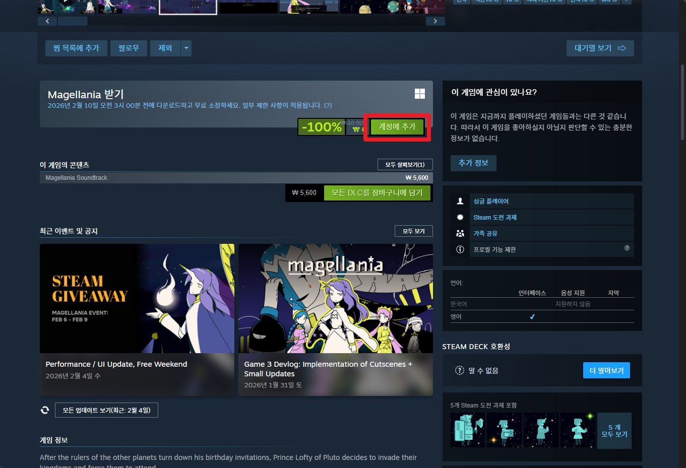"Magellania (마젤라니아)" 게임을 나의 라이브러리에 추가해주기 위해 [계정에 추가] 버튼을 클릭합니다.