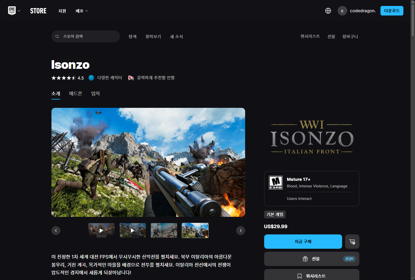 - "Isonzo (이손초)" 에픽 무료게임 페이지