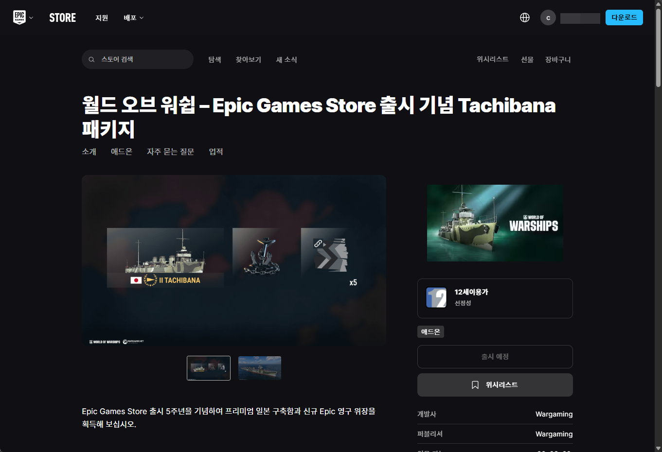 - "World of Warships - Epic Anniversary Tachibana Pack (월드 오브 워쉽 – Epic Games Store 출시 기념 Tachibana 패키지)" 에픽 무료게임 페이지
