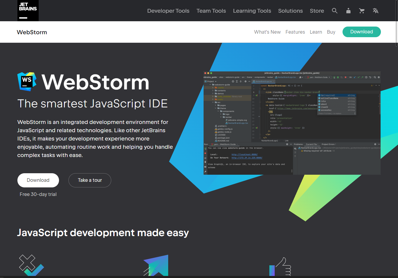 자바스크립트 개발 도구로 비주얼 스튜디오나 이클립스와 같은 통합 개발환경(IDE)을 제공합니다.